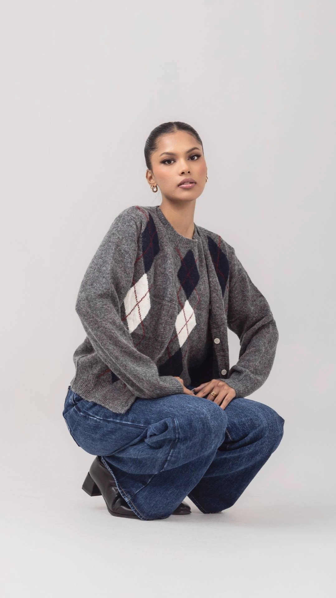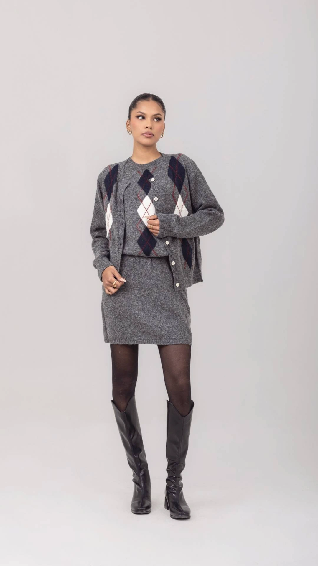 Argyle Diamond Cardigan Set in Cream