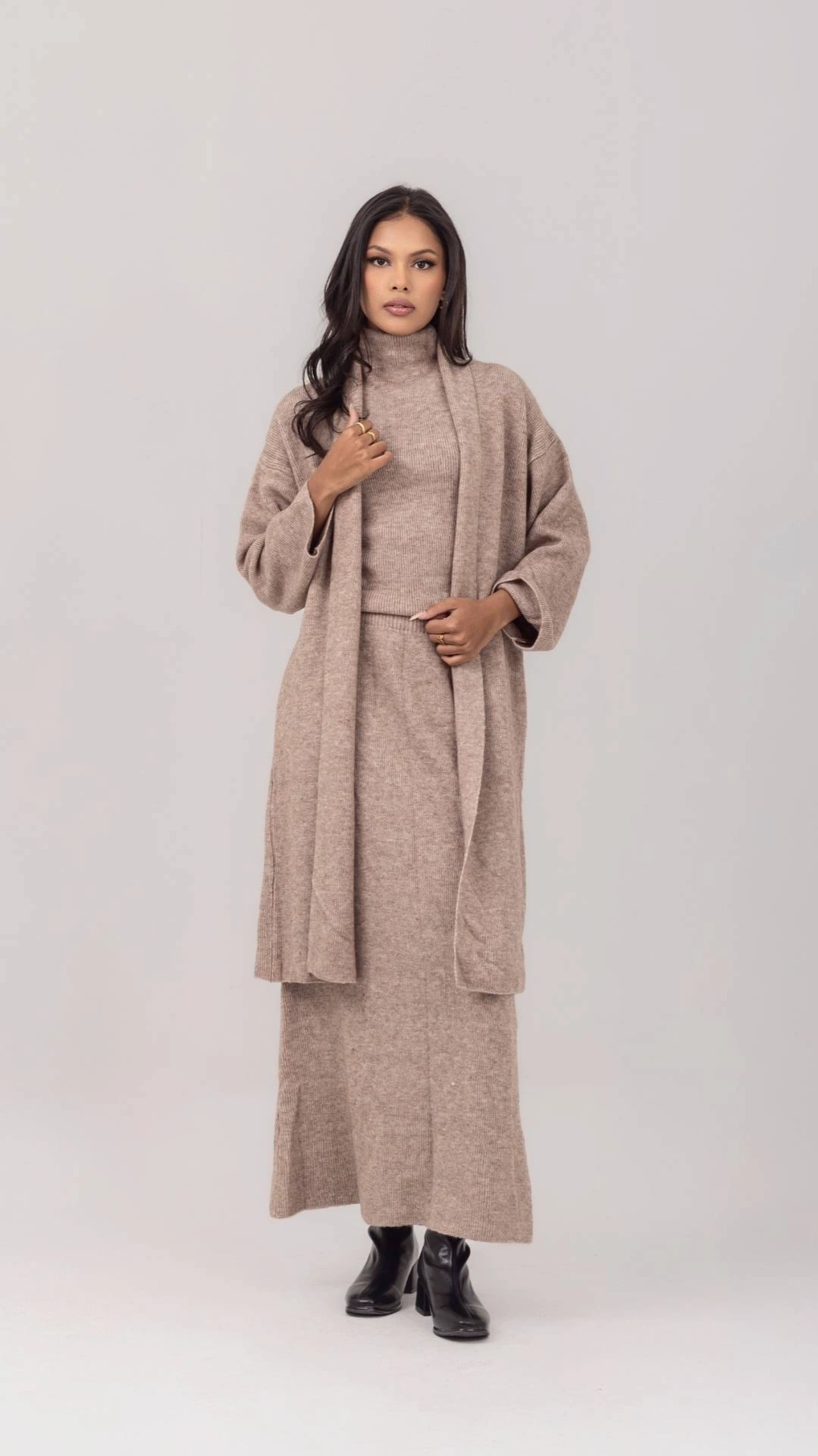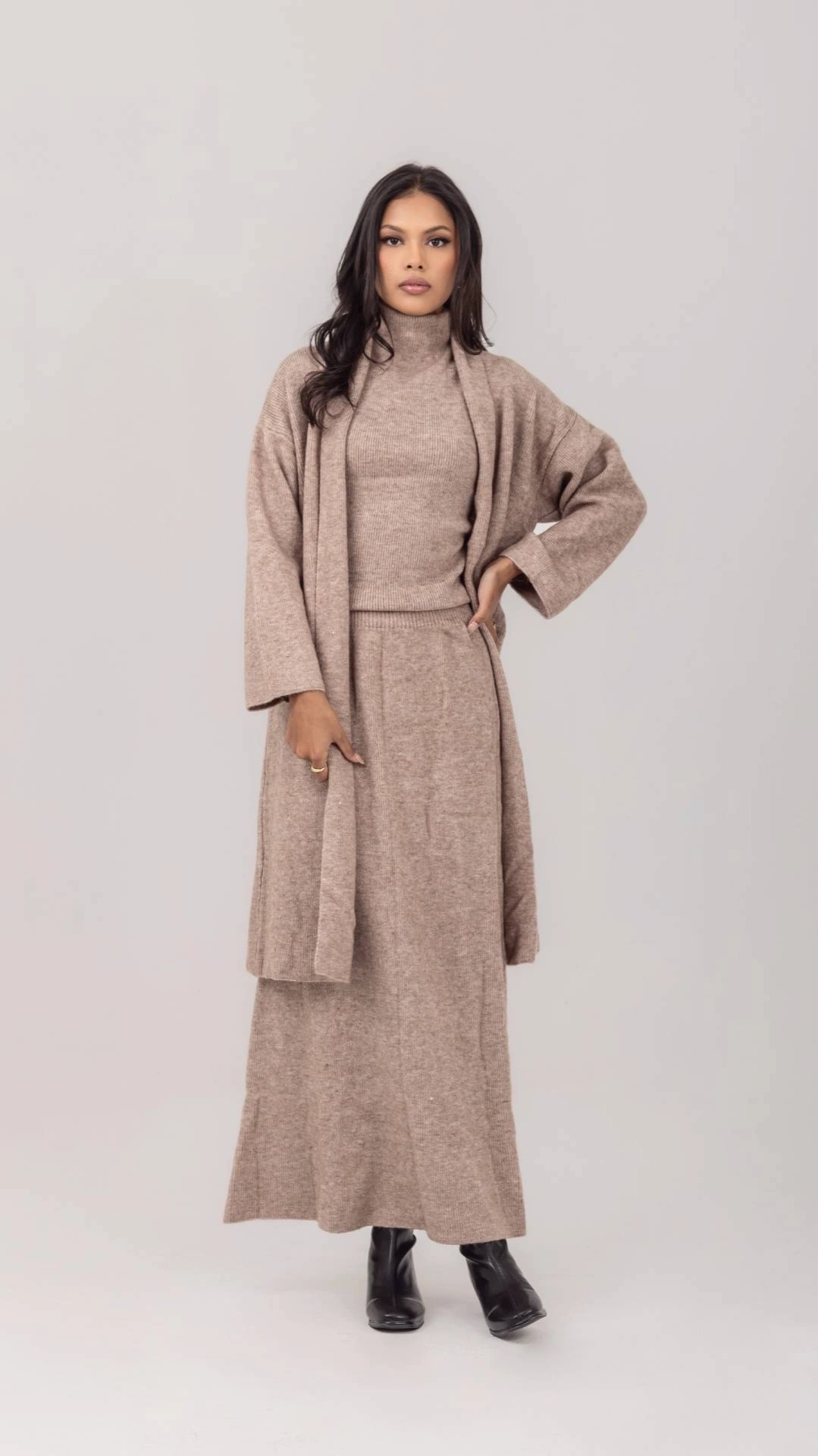 3 Piece Set: Sleeveless mock-neck, Maxi skirt, & Cardigan