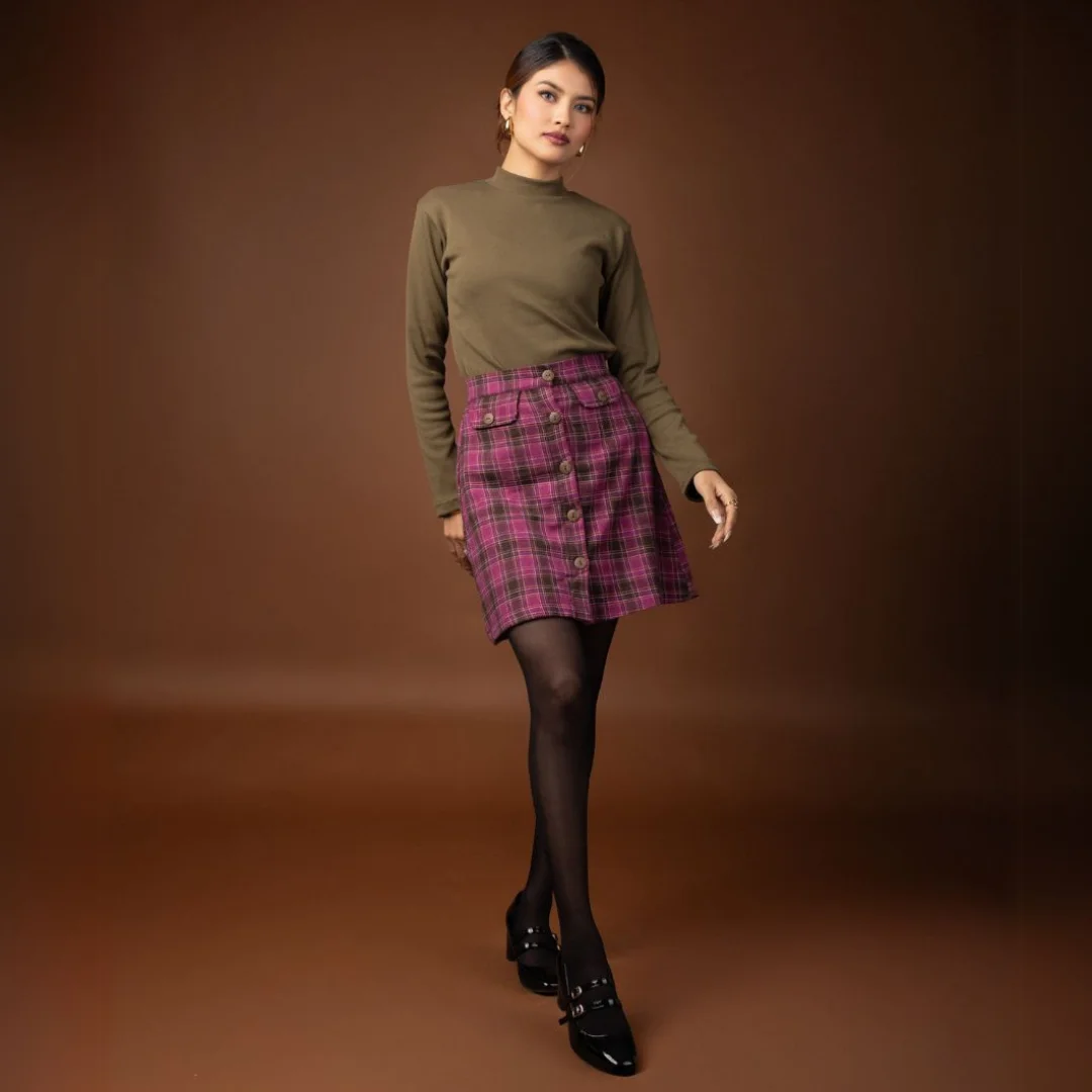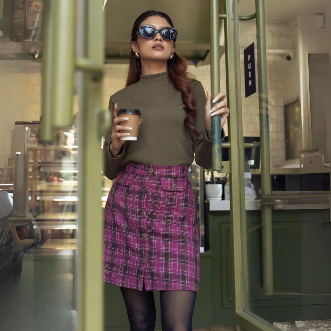 Meet your new go-to mini! With its retro A-line cut and a pink and olive check print, this skirt is a total vibe. Complete with wooden button detailing and flap pockets, it pairs perfectly with stockings and boots for that perfect throwback look. 👢