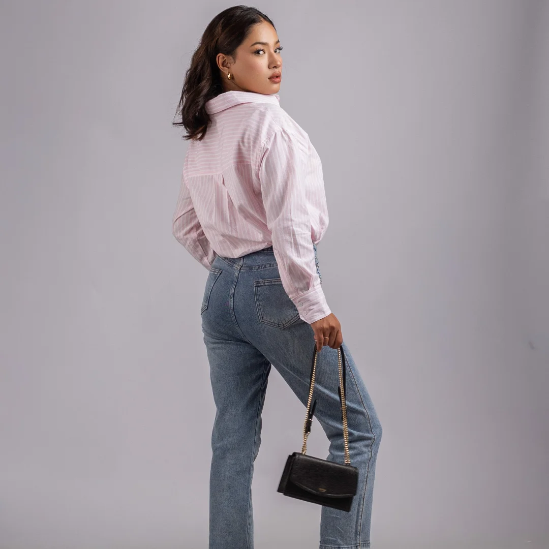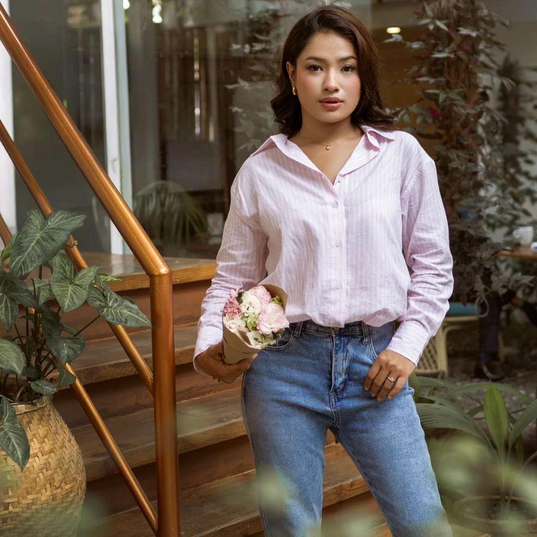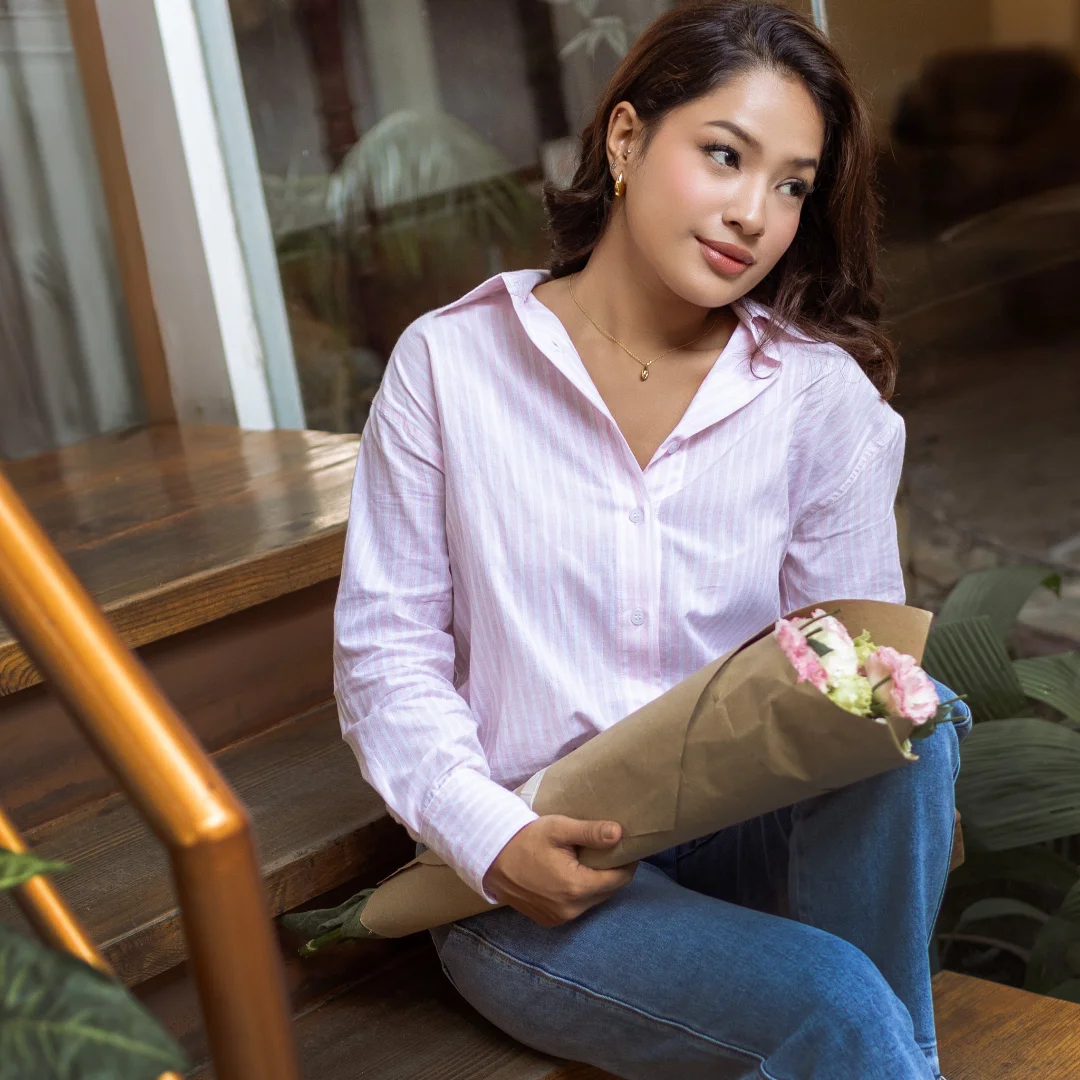 The classic boyfriend shirt just got a sweet upgrade! It's slightly oversized fit and the perfect blush pink hue will have you reaching for it again and again.