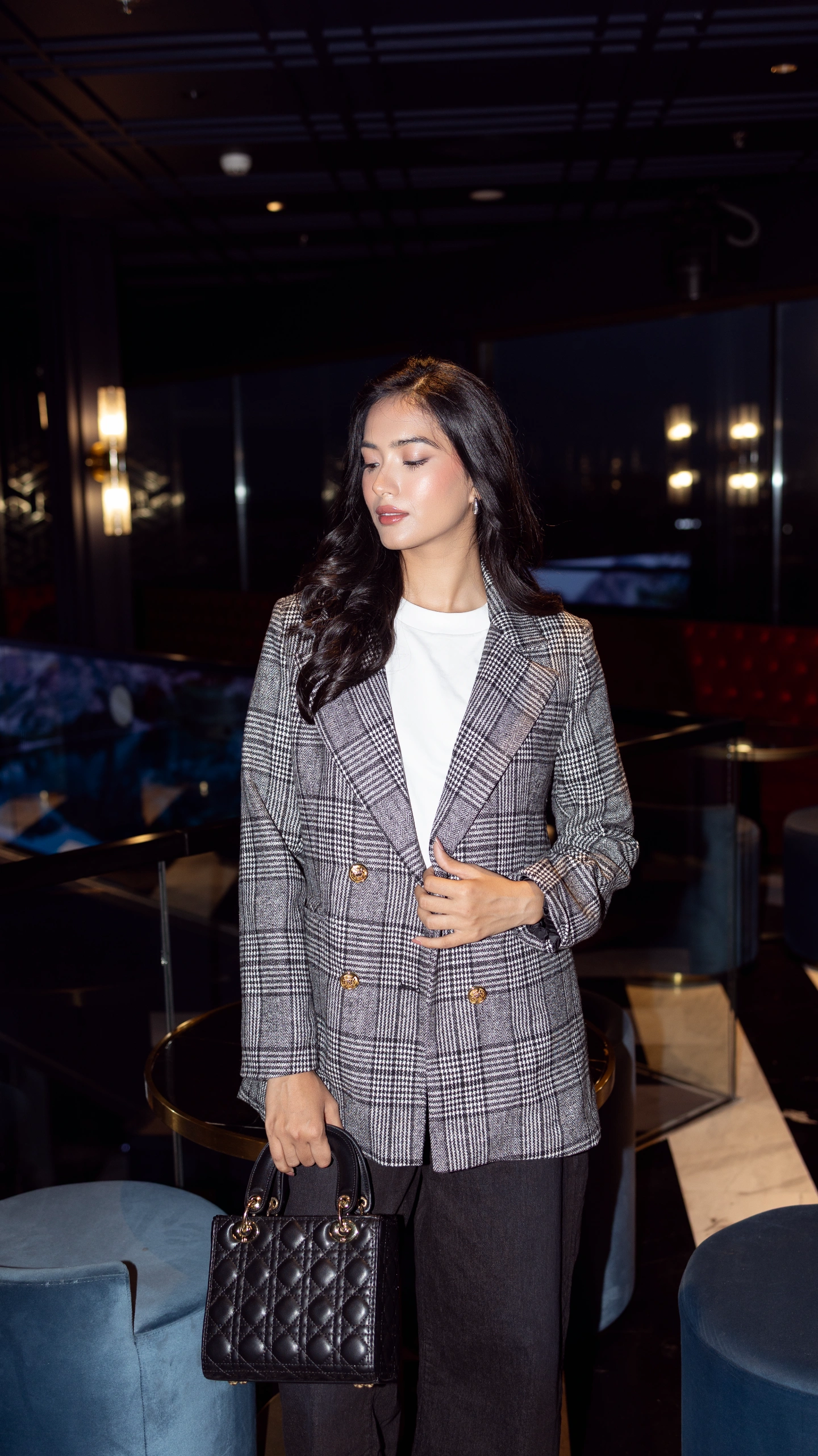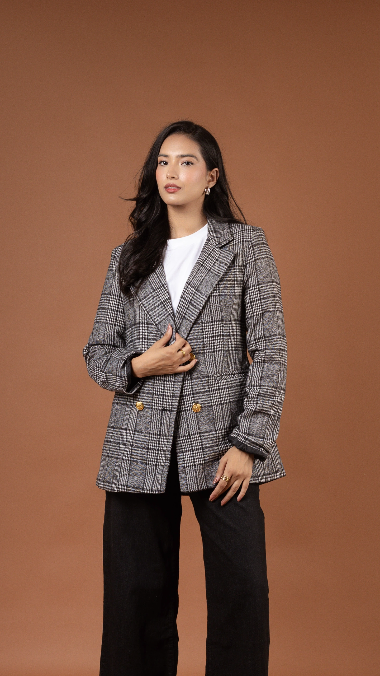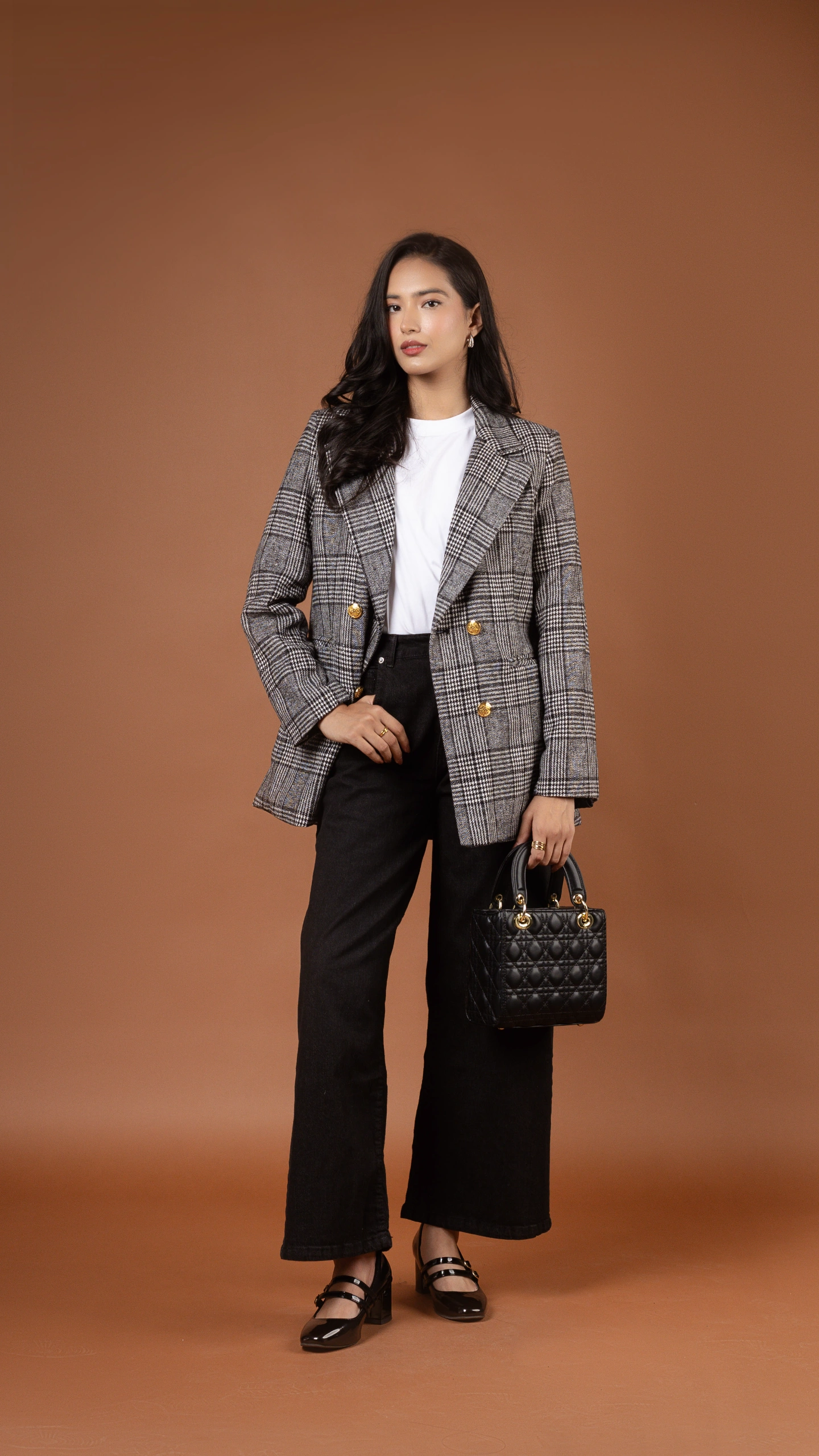A modern classic reimagined. Defined by precise tailoring and metallic buttons, this double-breasted blazer stands out in bold black-red and black-white houndstooth options. Sharp yet versatile — the kind of piece that elevates every outfit.