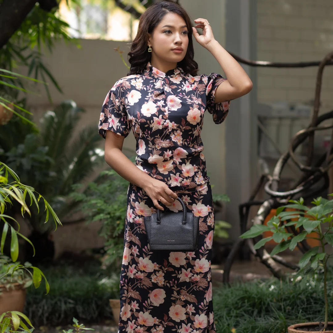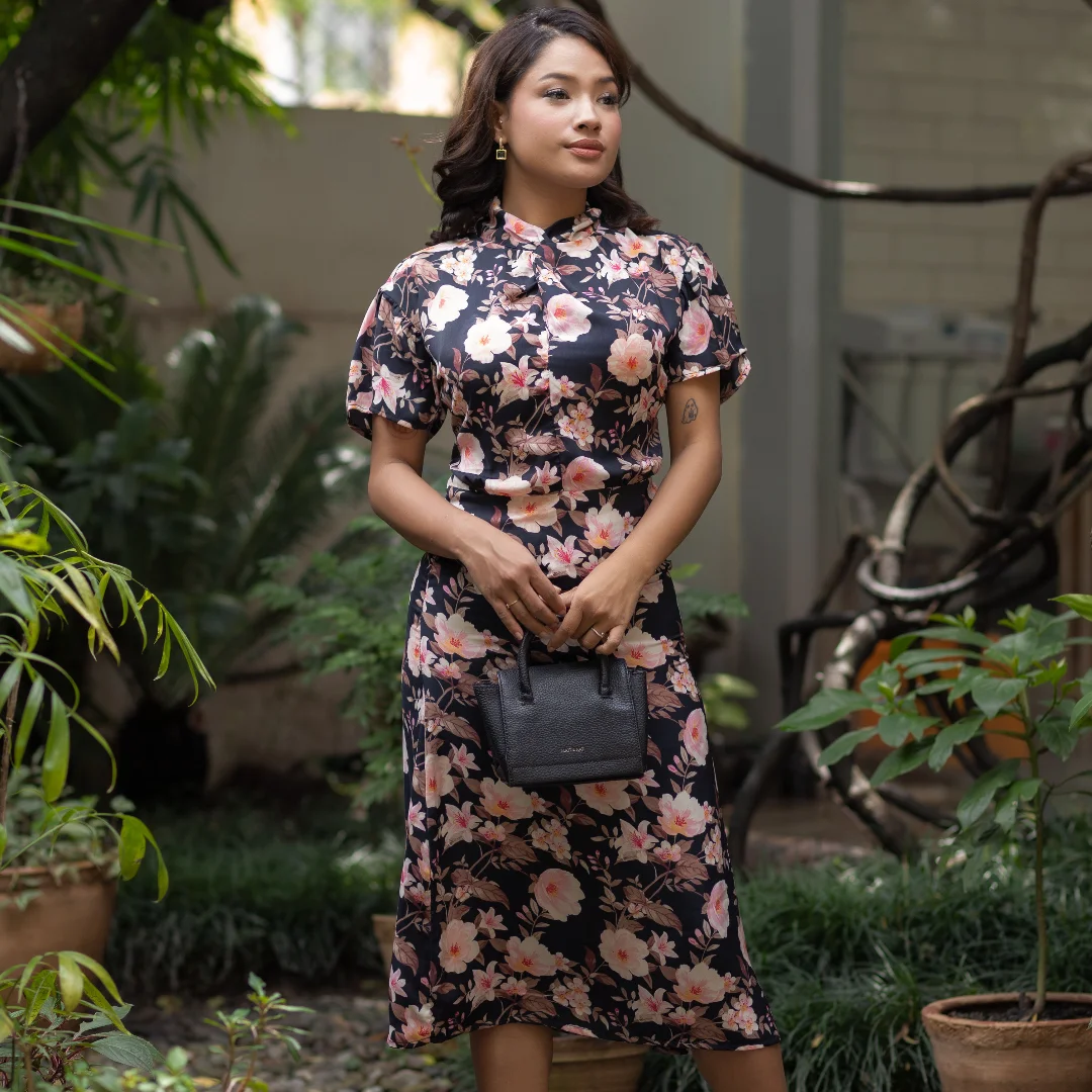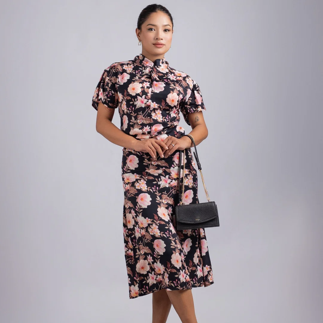 The Grace Satin Dress features a stylish twist neck and delicate keyhole. This midi-length beauty captures the essence of sophisticated elegance, making it the perfect choice for all your special occasions.