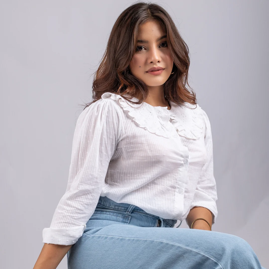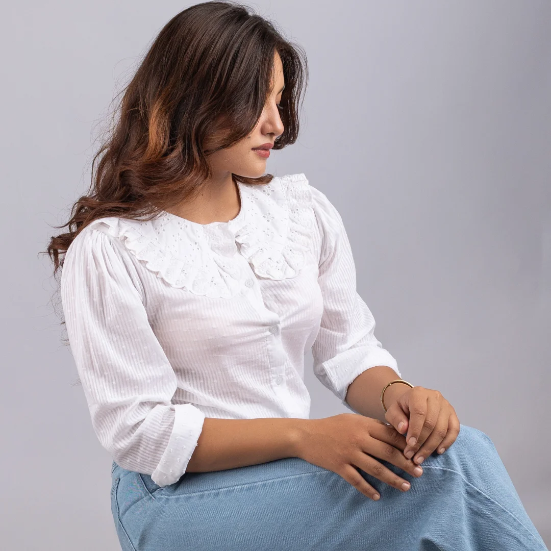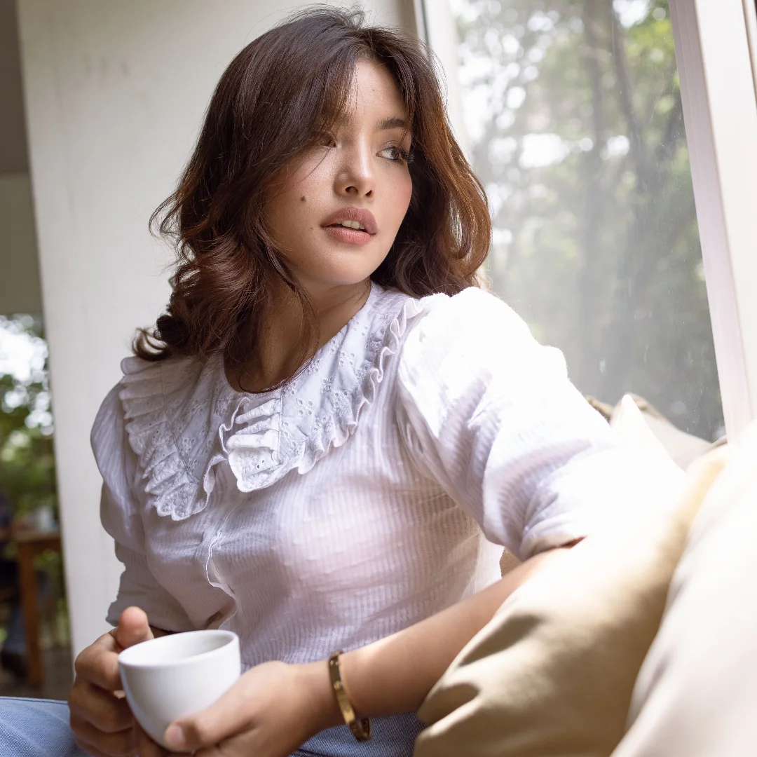 The Luna Peter Pan Top, designed in a soft cotton, is a charming fall essential. Its classic Peter Pan collar adds a sweet touch, making it easy to style under your favorite sweater.