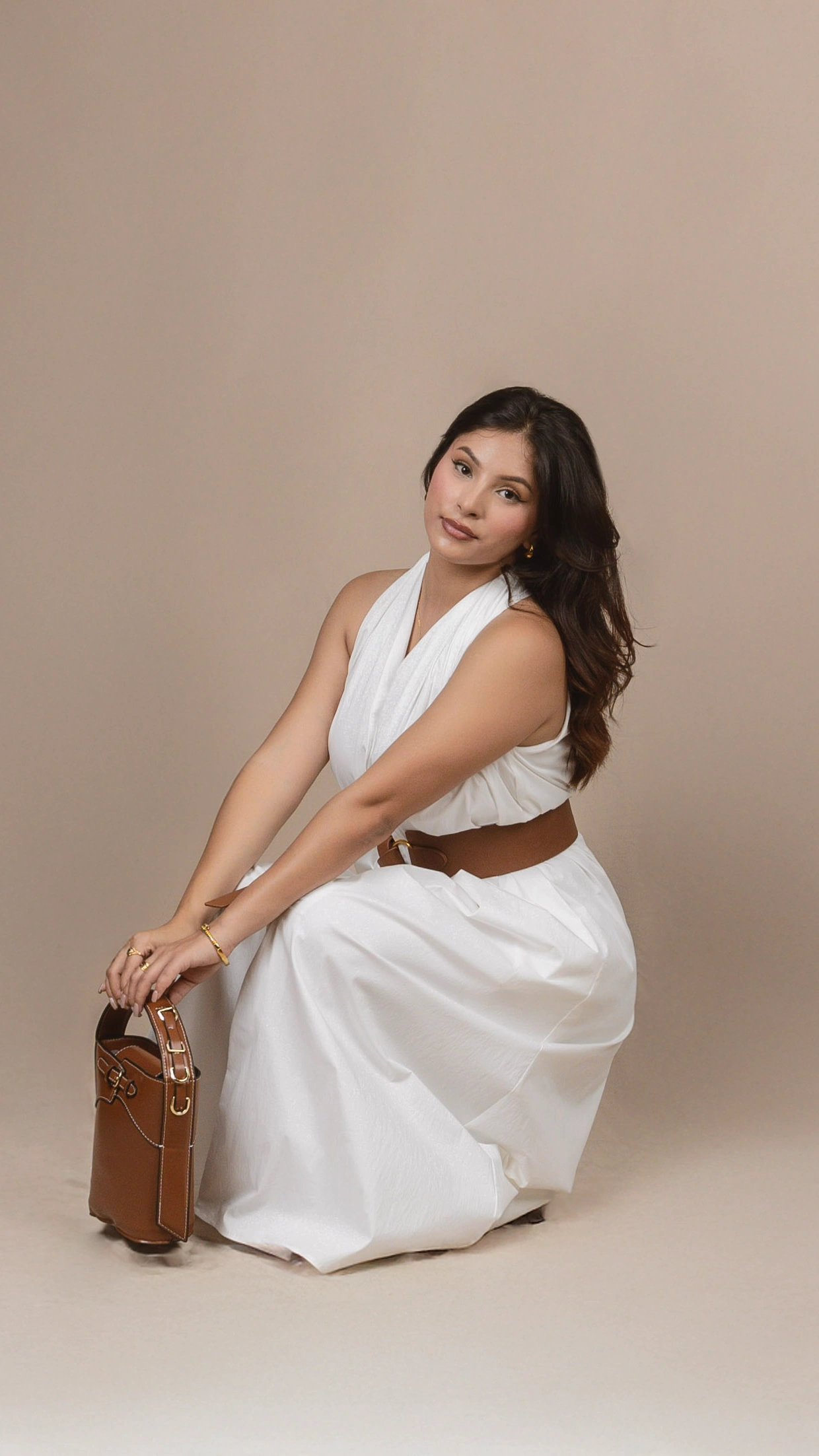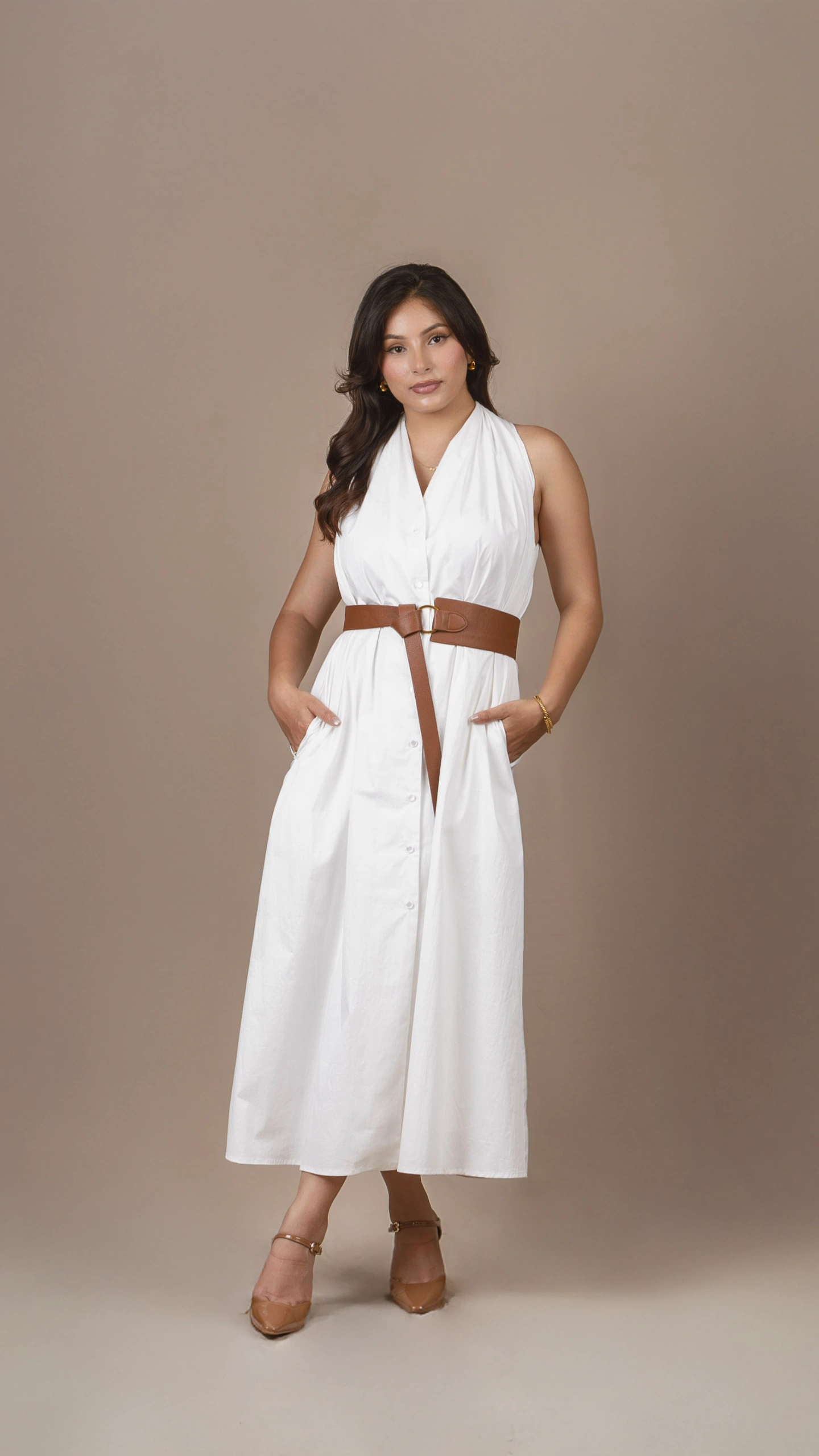 The Madelyn Maxi blends timeless charm with modern ease — a halter neckline and belt make it the perfect canvas for day-to-night looks.