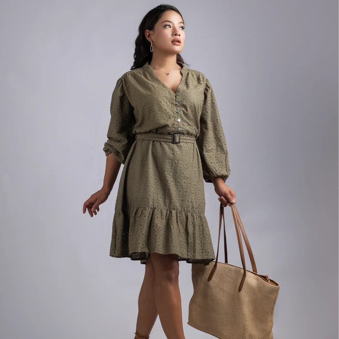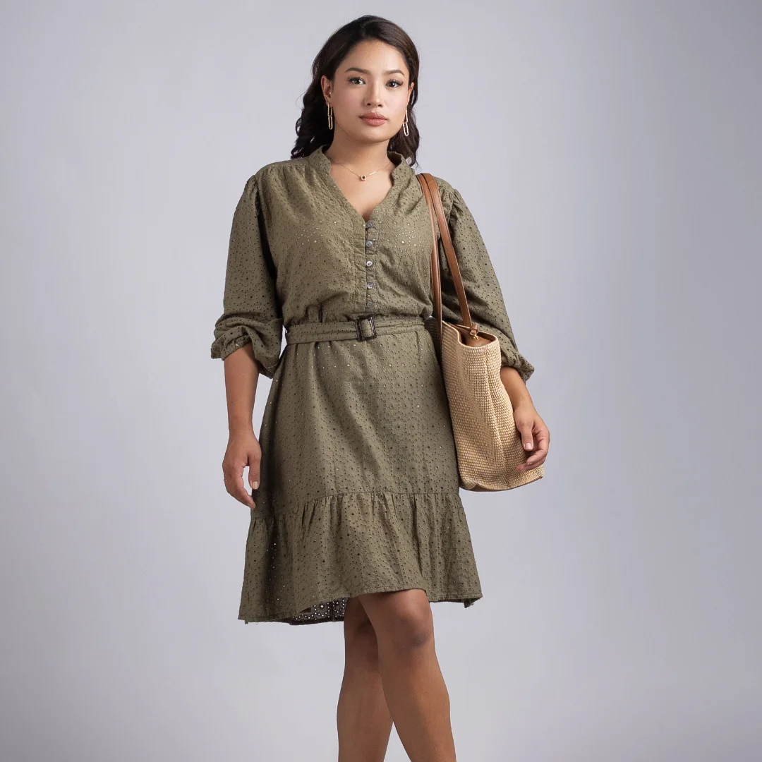 Step into effortless elegance with the Mila Eyelet Belted Dress. Featuring a chic, playful design in classic white and earthy olive green. Perfect for an everyday look that's casual yet undeniably polished.