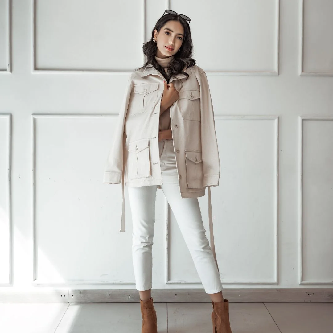 Elegance meets utility with our Twill Safari Jacket. Featuring flap pockets and a waist belt, it is perfect for creating stylish everyday looks.