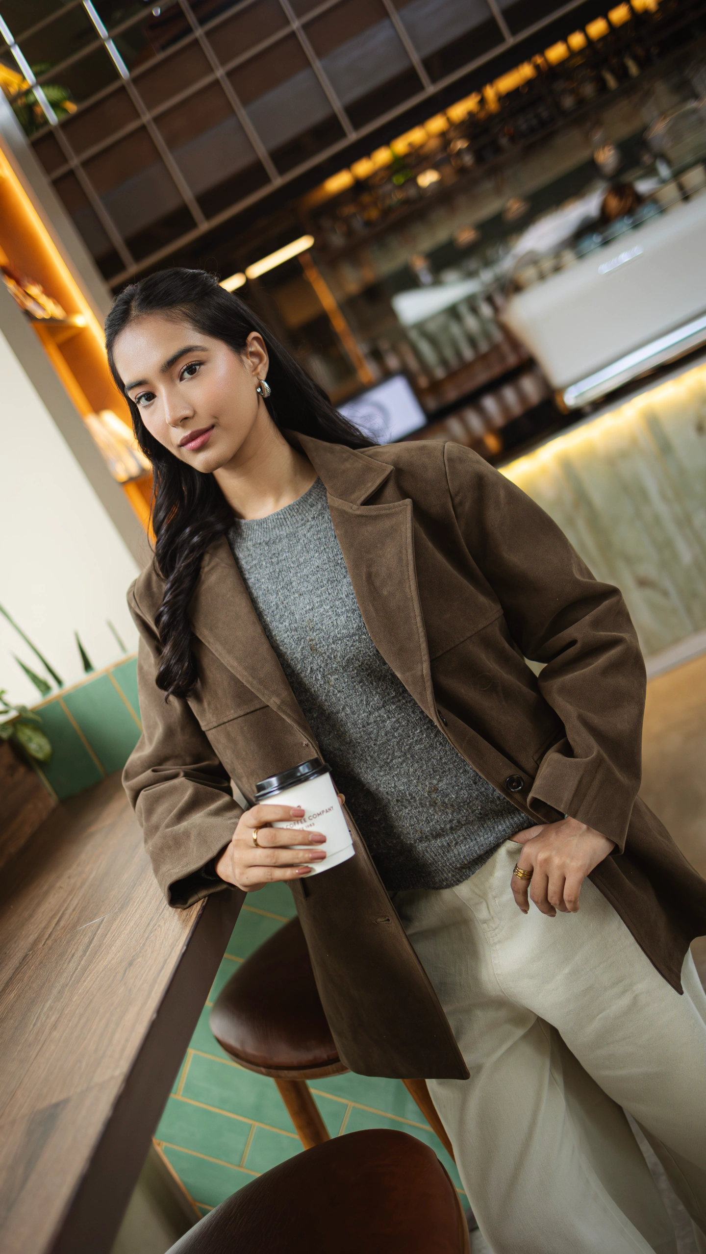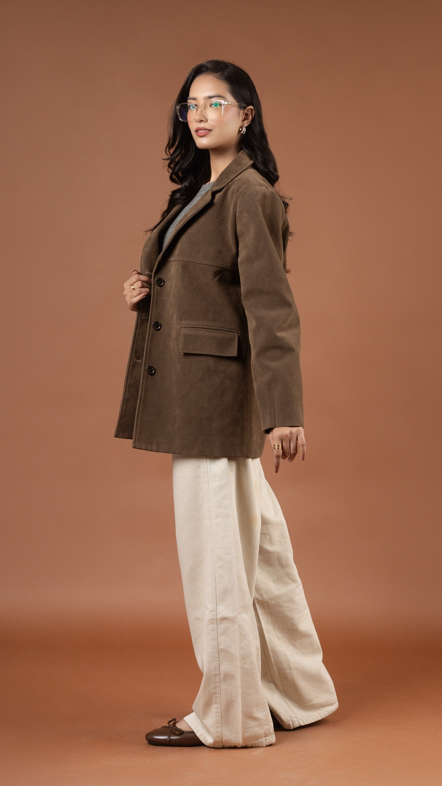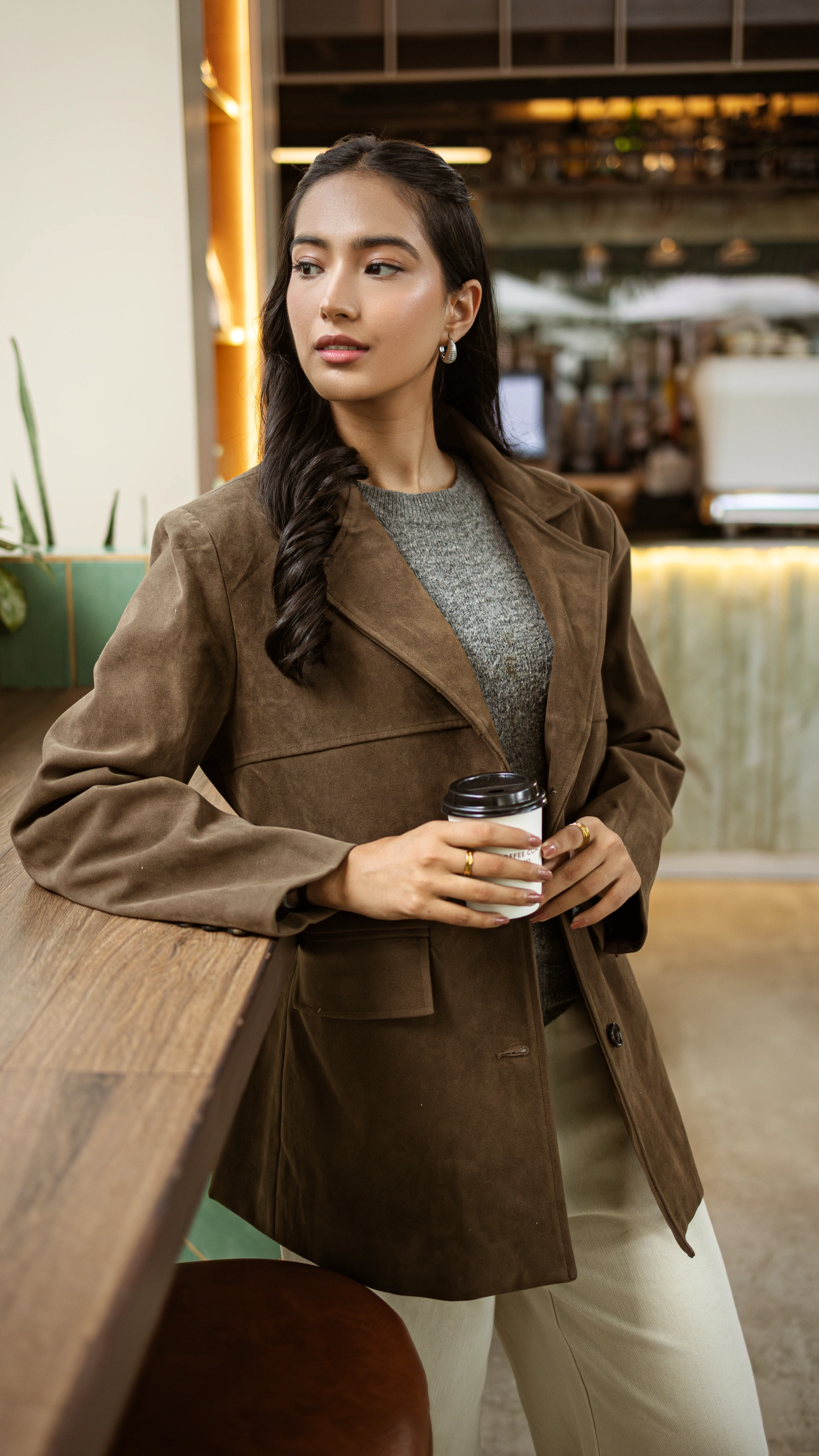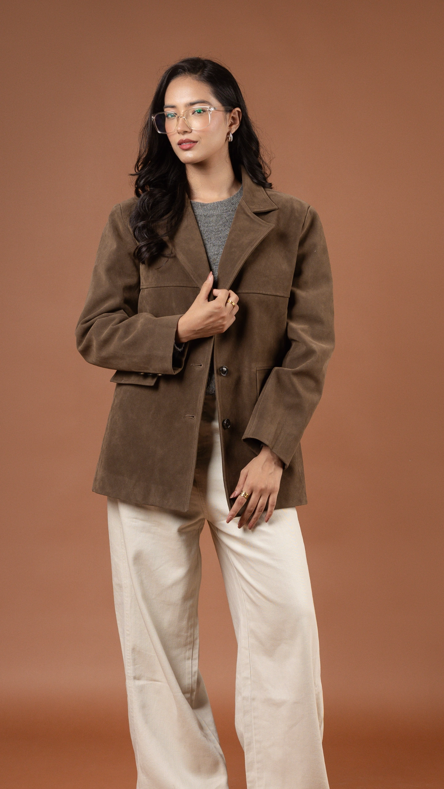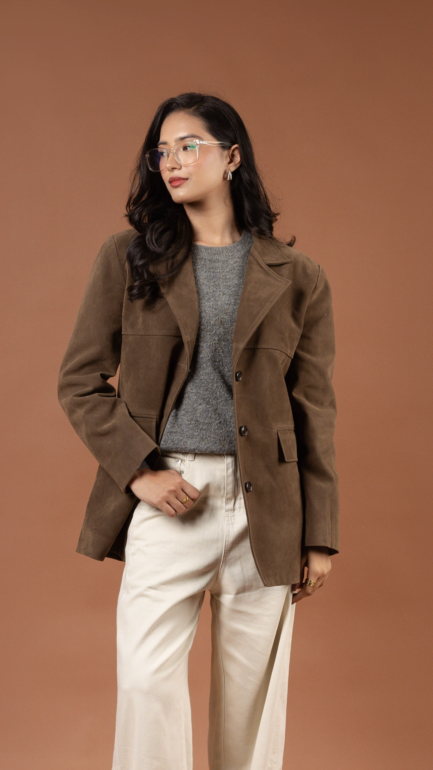 Classic meets retro — this suede blazer in rich brown nods to vintage silhouettes with a contemporary attitude. Perfect for adding warmth and personality to any ensemble.