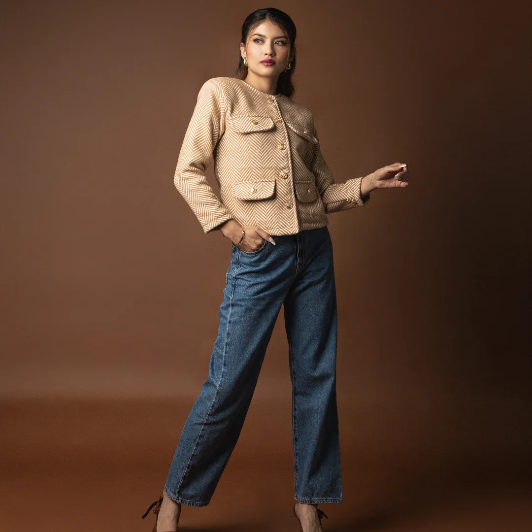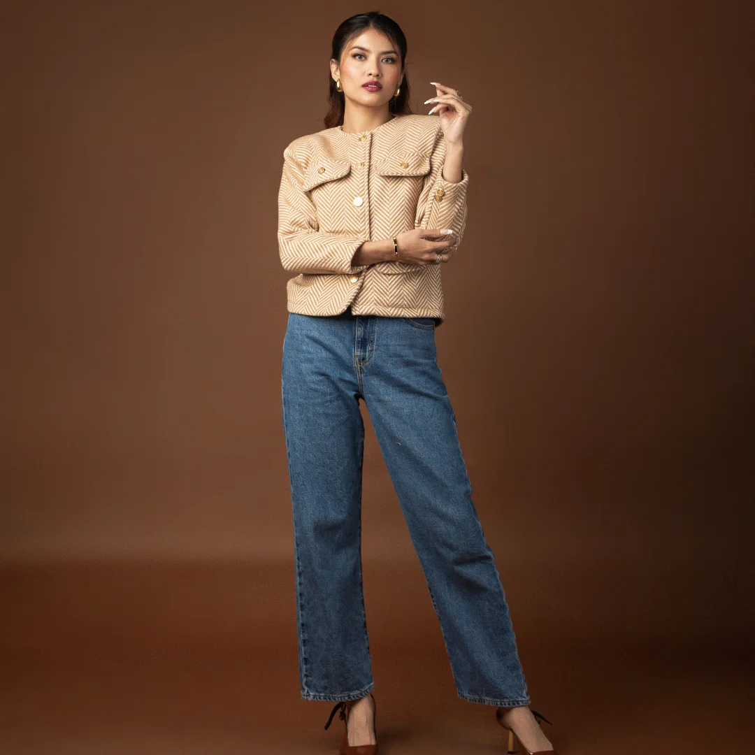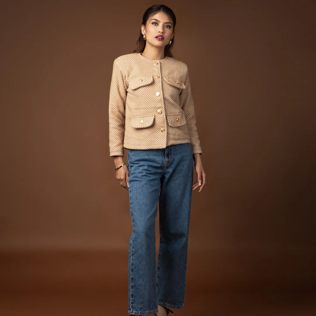 Introducing our Classic Tweed Jacket, a timeless piece that blends elegance with versatility. This chic jacket comes in a soft beige fabric with subtle striped detailing, giving it a refined, textured look. The gold metallic buttons add a touch of sophistication, making it easy to dress up for an evening out or style for polished daytime looks.