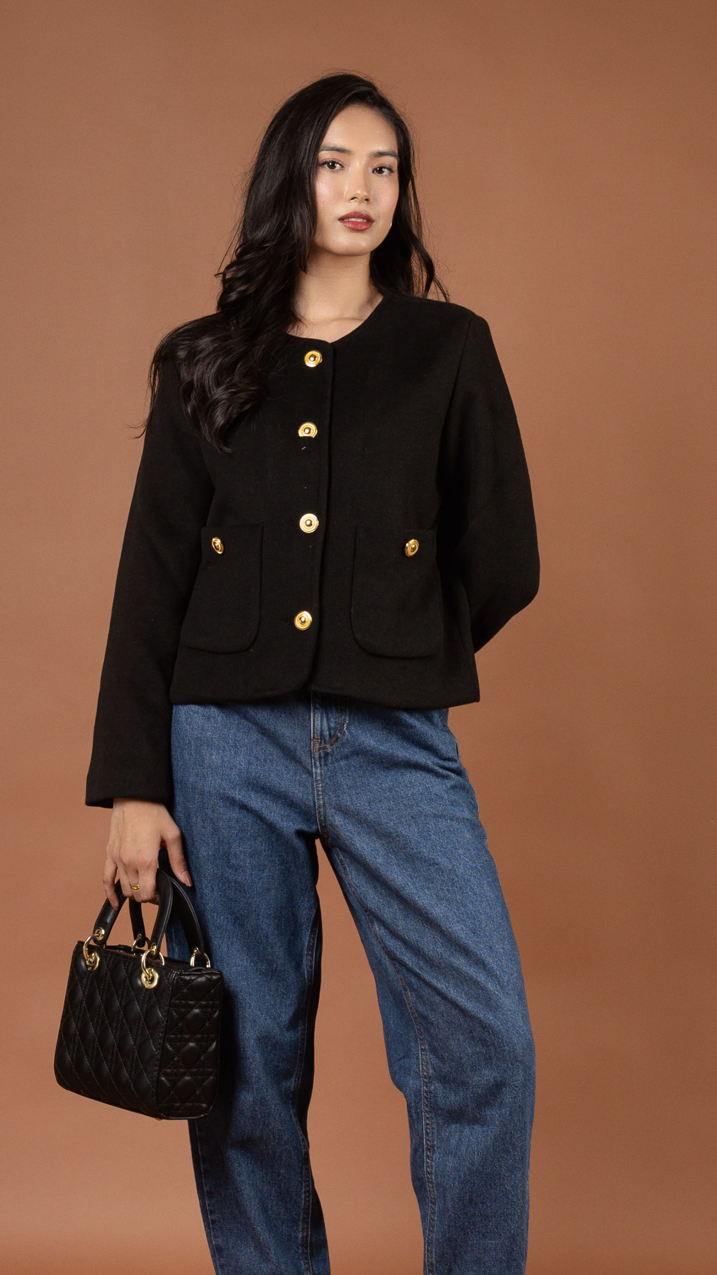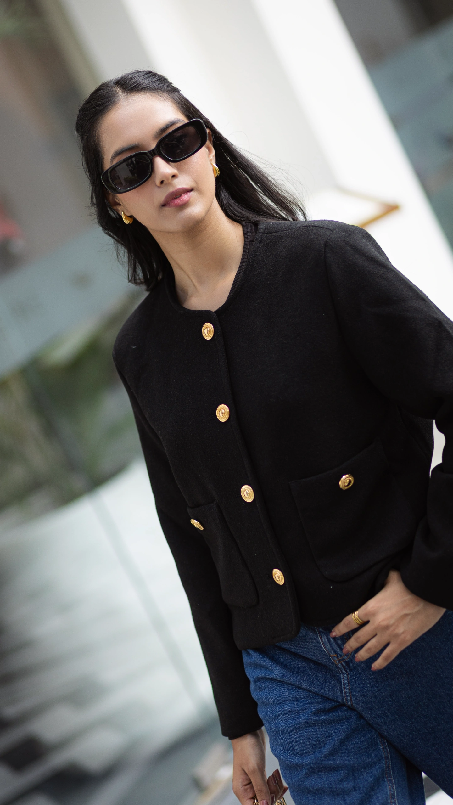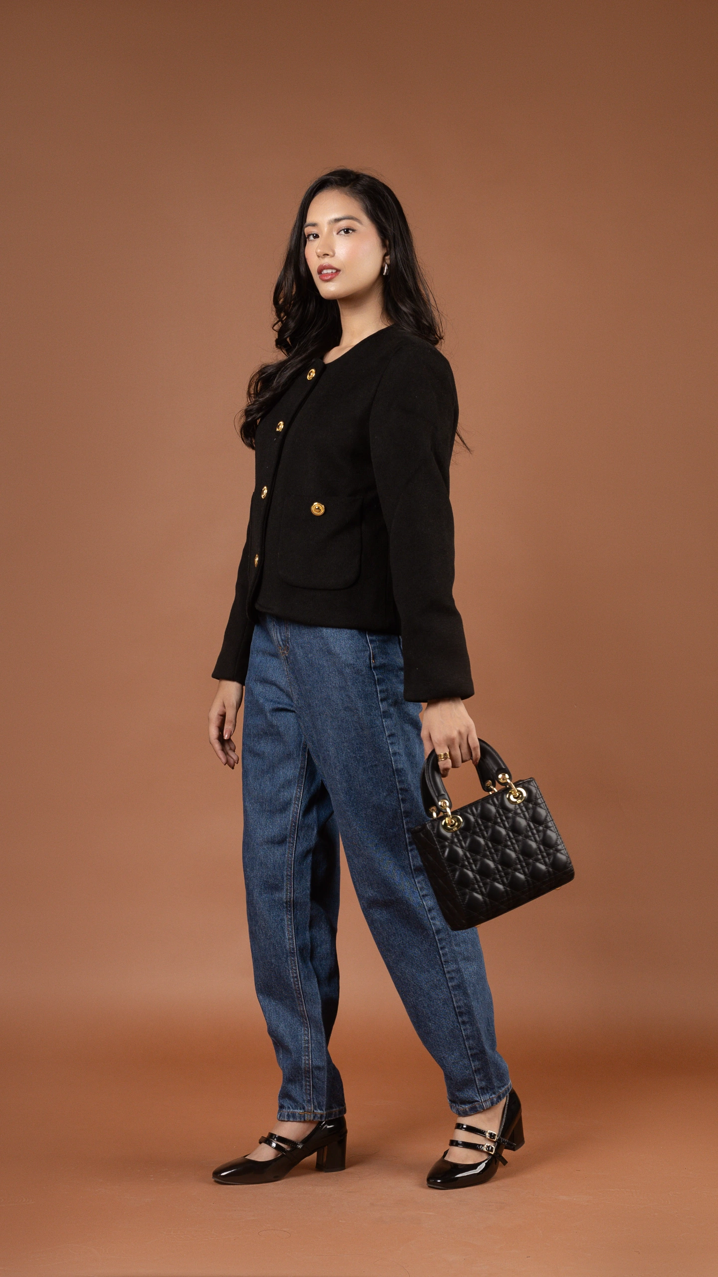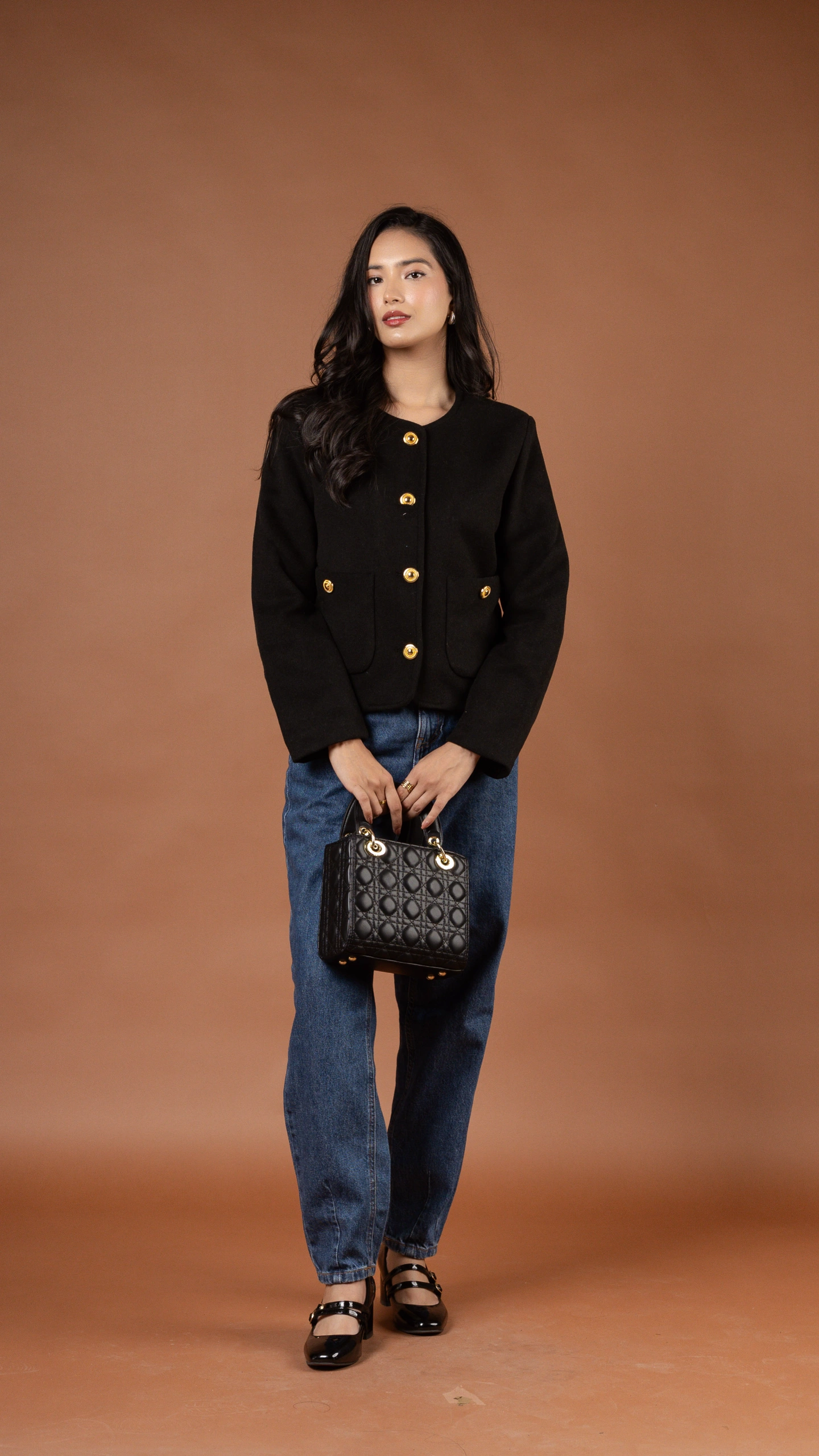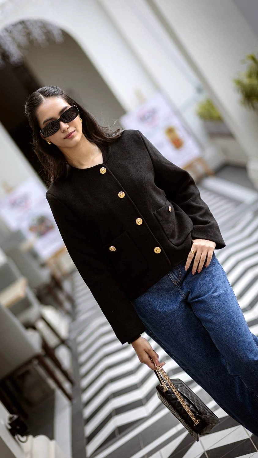 A winter wardrobe essential with an effortless charm. This tweed jacket pairs easily with structured or relaxed silhouettes, featuring versatile hues in black, moss green, and brown-blue check. Cozy texture meets city sophistication.