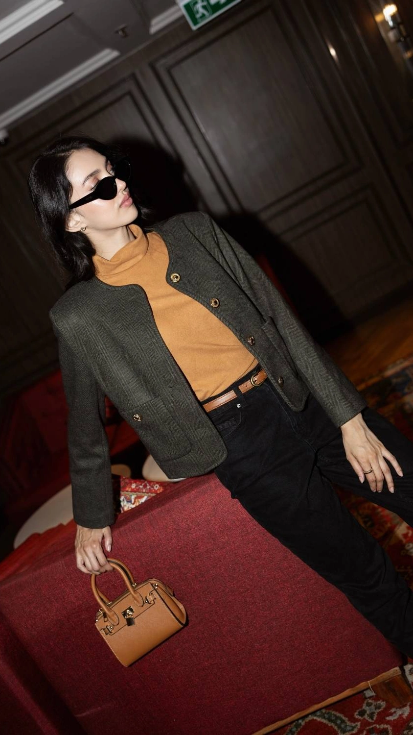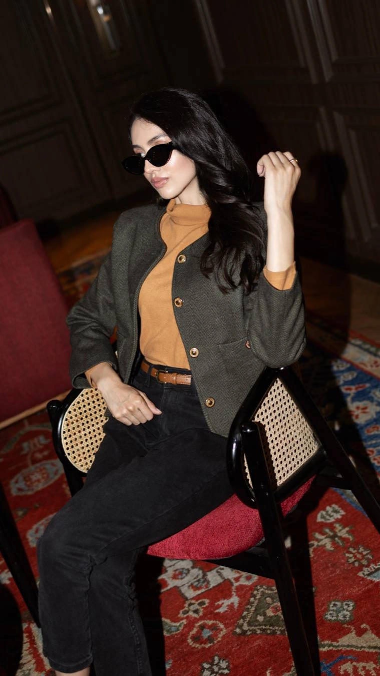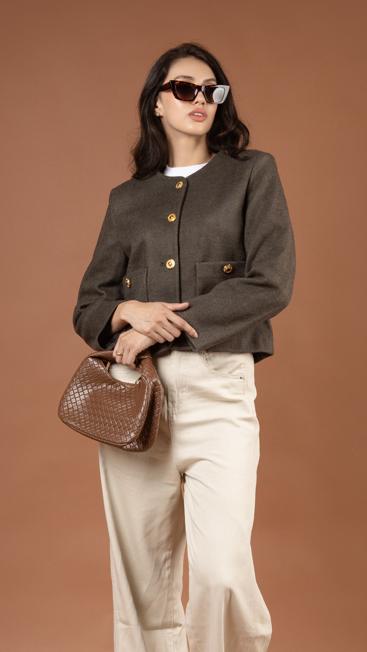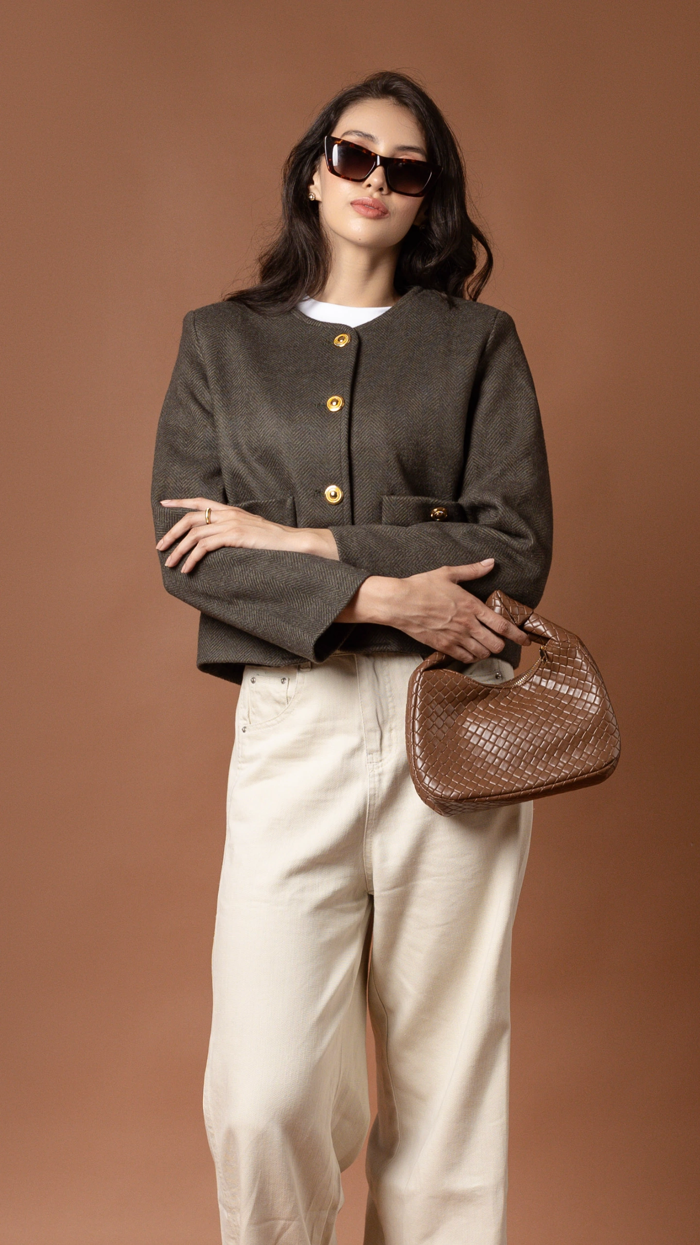 A winter wardrobe essential with an effortless charm. This tweed jacket pairs easily with structured or relaxed silhouettes, featuring versatile hues in black, moss green, and brown-blue check. Cozy texture meets city sophistication.